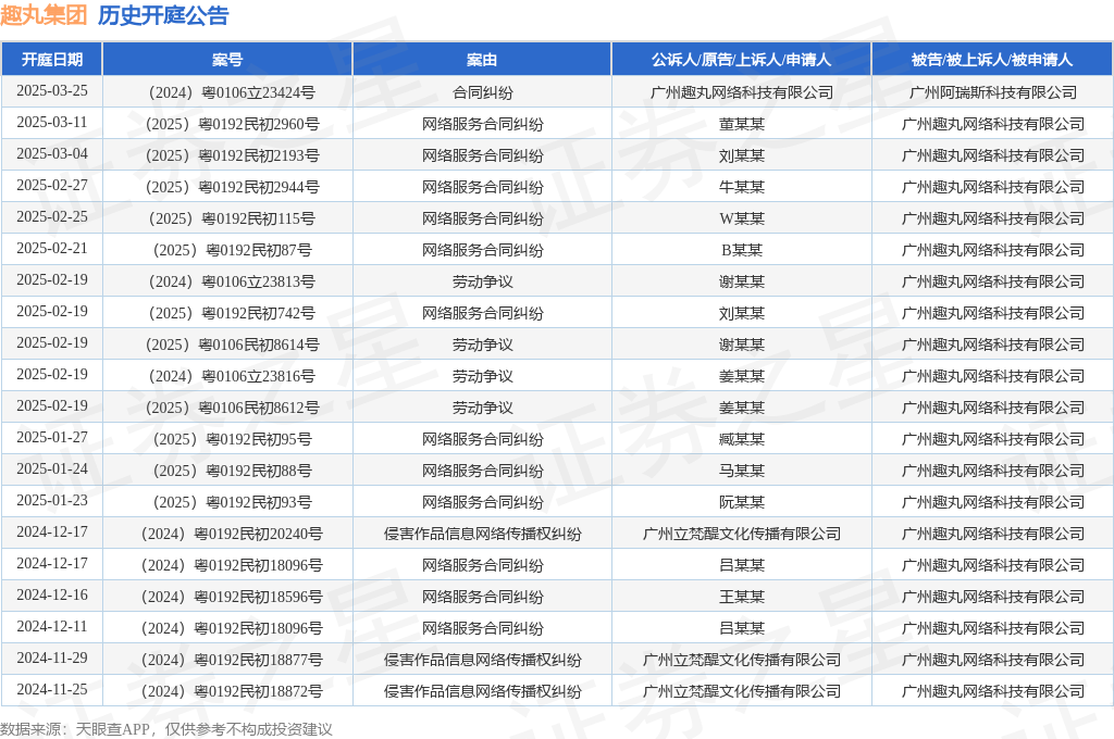案号:(2025)粤0192民初742号审理法院:广州互联网法院案由:网络服务合同纠纷当事人信息: 原告/上诉人:刘某某 被告/被上诉人:广州趣丸网络科技有限公司开庭日期:2025年2月19日根据统计,近一年内以广州趣丸网络科技有限公司为当事人的历史开庭公告有67则,其中案由为“网络服务合同纠纷”的公告以47则居首,其次为“侵害作品信息网络传播权纠纷”有10则,“劳动争议”有5则。历史开庭公告(前20条)如下: